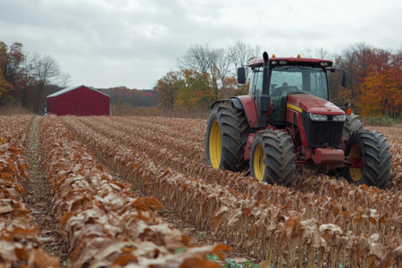 Red tractor is driving over a harvested soybean field in front of a red barn in autumn