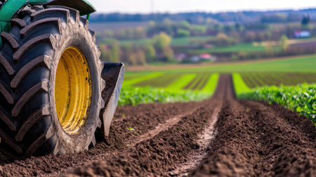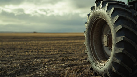 Close-up of a tractor wheel in a farm field, with plenty of space around for copy or branding.
