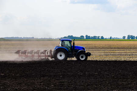 Lush and loosen the soil on the field before sowing. The tractor plows a field with a plow.