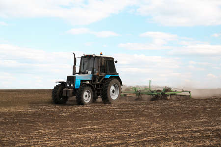 The tractor harrows the soil on the field and creates a cloud of dust behind it.