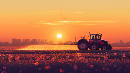 Tractor spraying pesticides on field with flowers at sunset, 3d render