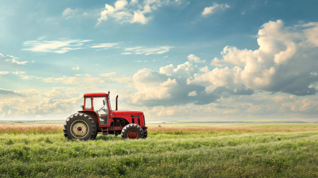 A red tractor sits in a vast green field under a bright sunny sky. The scene depicts rural peacefulness