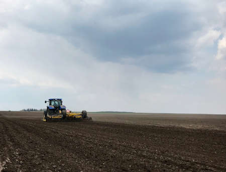 Vinnitsa, Ukraine - April 20, 2022: Spring sowing season. Farmer with a tractor sows corn seeds on his field. Planting corn with trailed planter. Farming seeding