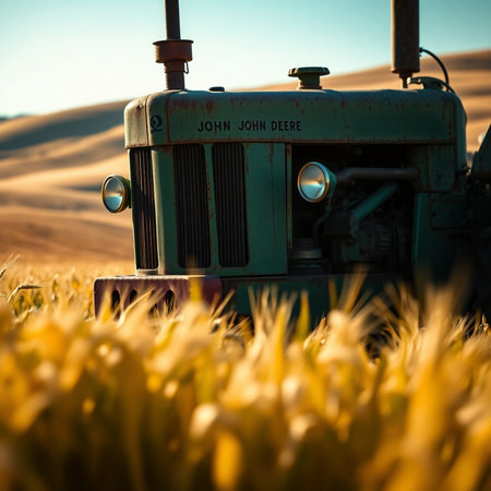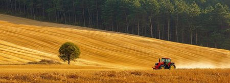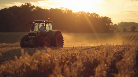 A tractor working in a golden wheat field during sunset, with rays of sunlight creating a warm and serene rural landscape.