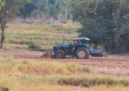 Tractor plowing farm preparing soil for new crop plantation during the evening.