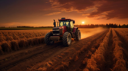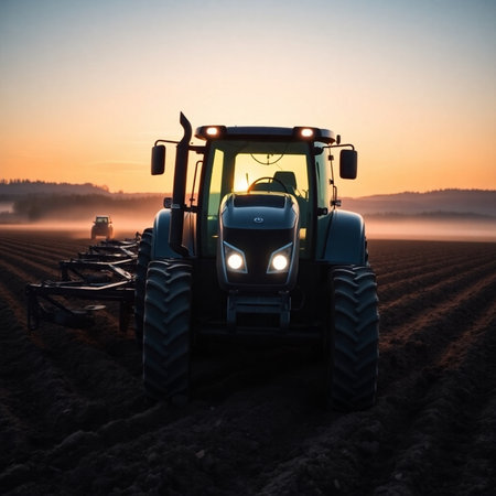 A powerful tractor works the field at sunset, creating a dramatic silhouette against a vibrant orange sky, highlighting the dedication of agricultural life.