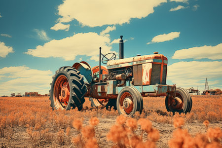 a tractor gracefully glides through a vast field, embodying the essence of haiku-like simplicity. its presence evokes a sense of freeform minimalism, reminiscent of polished concrete. with a touch of dutch golden age aesthetics, this image captures the spirit of quantumpunk and the artistic influence of group f64. above all, it resonates with a profound working-class empathy. ai generated