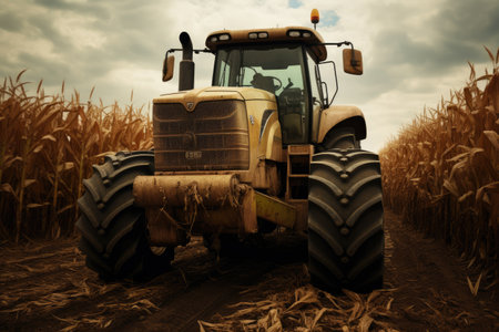 A big tractor in corn field, combine harvester harvests ripe, Ai generated