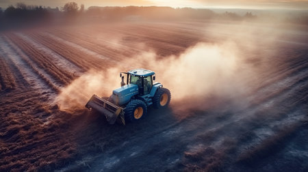 tractor in field at sunset with spraying of crops. a tractor is working in a farm field. aerial view or top view, by ai generative