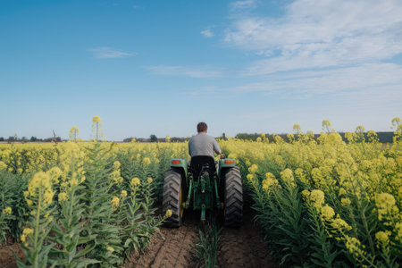 Farmer driving small tractor through blooming canola field under a clear blue sky, enjoying a peaceful day in agricultural landscape