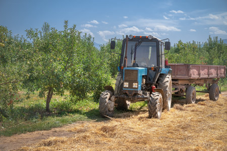 Old tractor with a trailer stands in an apple orchard