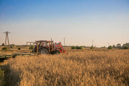 Old red tractor in the field, Ukrainian fields and old machinery, hay harvesting in the field. 2021