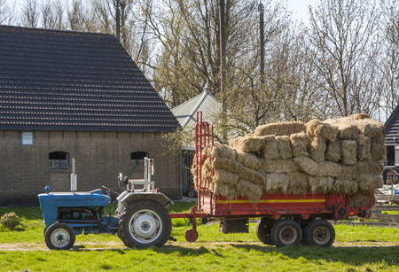 The tractor is carrying hay