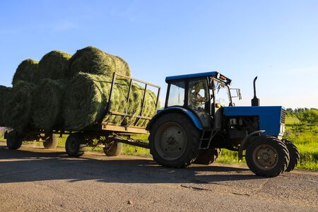 Tractor transports round bales and hay on hay trailer. Silage for farm animals. Hay as feed for beef and dairy cattle. Bale trailer with crop grass on country road. Round bales from field to storage.