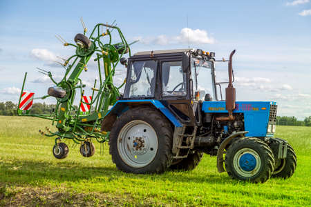Russia, Leningrad Region - June, 2019: Powerful tractor of the BELARUS brand at the exhibition