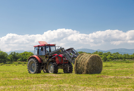 tractor removes the hay in the field