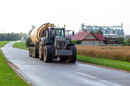 A tractor with a modern fertilizer trailer riding on the country road along the field on a summer day.