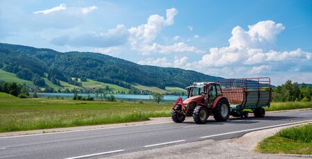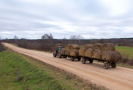 Tractor transports round bales and hay on hay trailer. Silage for farm animals. Hay as feed for beef and dairy cattle. Bale trailer with crop grass on country road. Round bales from field to storage.