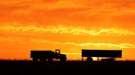 A stunning silhouette of a truck and trailer sits against a vibrant sunset sky filled with warm colors, creating a serene rural backdrop. The tranquil scene captures the essence of evening in nature, highlighting the beauty of farming and transportation.