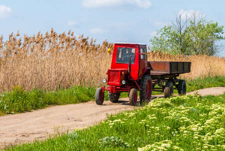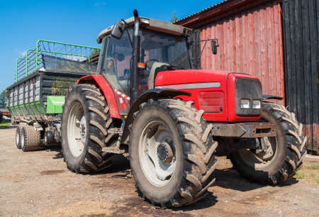 Red tractor with trailer against lighthouse and blue overcast sky in spring at sunset. Agricultural tractor. Agricultural machinery and machines in bright sunny day. Landscape with vintage toning