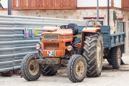 Side, Turkey -January 22, 2022: Old orange Tractor of brand Turk Fiat 640 is parked on the street on a warm summer day against the backdrop of a buildung