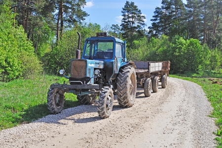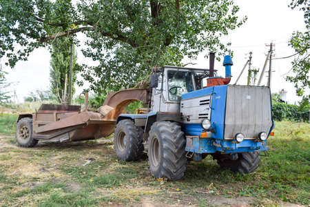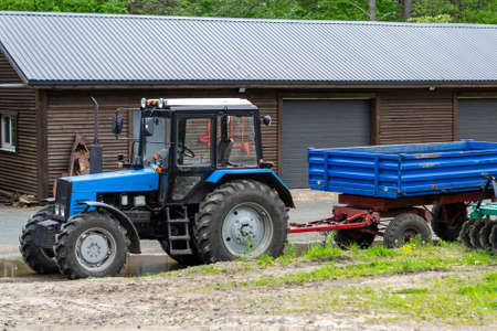Blue tractor with trailer. Equipment for agriculture. Successful farming