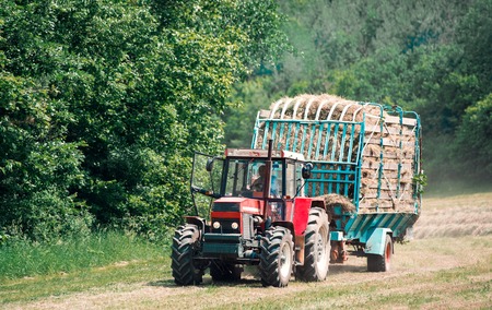 A man driving a tractor with a trailer full of hay on a field on a sunny summer day.