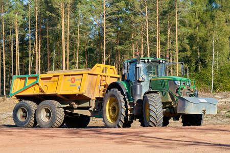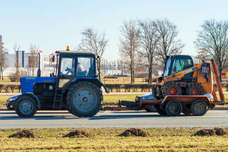 Saint Petersburg, Russia - 19 April 2022. a tractor pulls a trailer with a small tractor on it