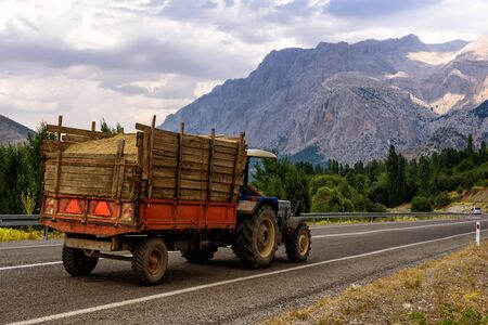 Panoramic view of the mountain with tractor on the road, forest and cloudy sky in summer, Turkey