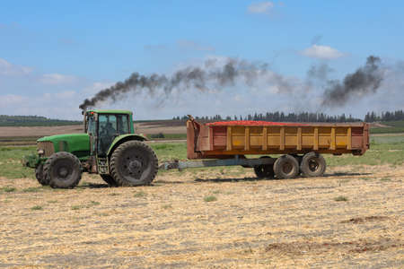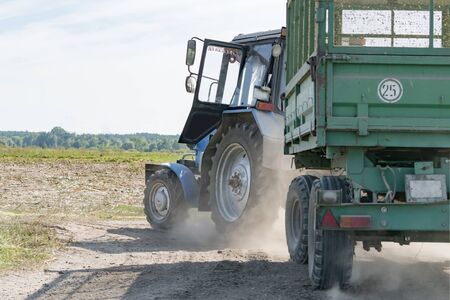 Tractor with full trailer of harvest. Harvesting, autumn time