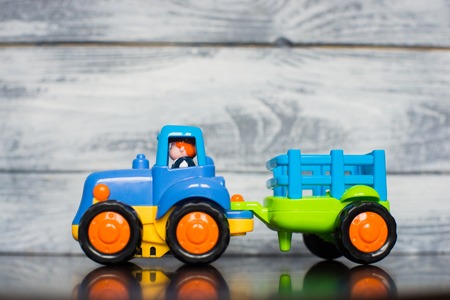 A grain of wheat in a cart of a toy tractor at sunset. High quality photo