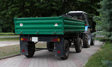 Tractor with trailer filled with old branches parked in the park at sunny winter day. Clean environment and fresh air