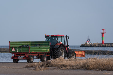 SWINOUJSCIE, WEST POMERANIAN - POLAND - 2022: Tractor of sea beach cleaning crew in front of navigation sign