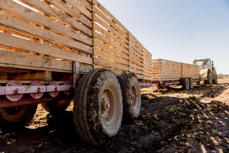 Badajoz, Spain - August 22th, 2018: Tractor transports three gondolas containers through tomatoes field at sunset. Tomatoes season at Vegas del Guadiana, Spain