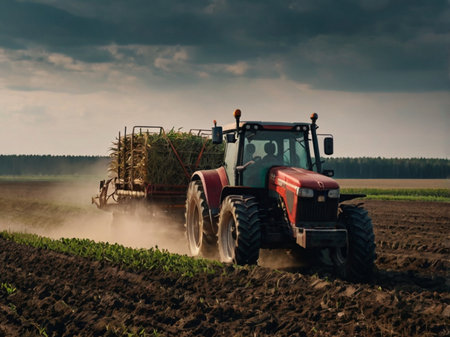 A tractor is cultivating a wheat field under a sunny sky, surrounded by a diverse plant community in the ecoregion, enhancing the natural landscape of the grassland