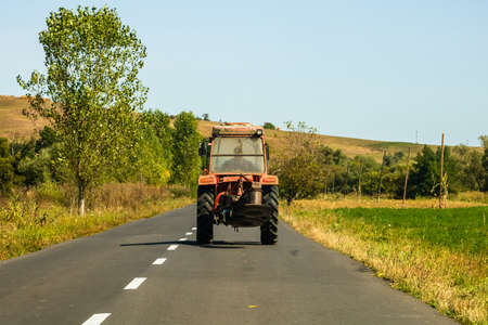 Red Tractor on the road in Autumn, unrecognizable Farmer driving tractor and preparing plows the land, agricultural works at farmlands, agriculture tractor