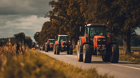 farmers gather in the city with their modern tractors during a strike, highlighting the clash of agricultural livelihoods against urban landscapes