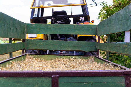 A yellow tractor stands behind a wooden cart filled with straw ready to transport hay on a sunny day at the farm. The scene captures the essence of rural life and agriculture.