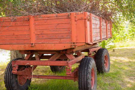 Trailer cart to the tractor on large wheels stands on the river bank under a birch full of branches
