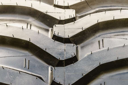 Black tyre of vehicle or agricultural and industrial machine, close up