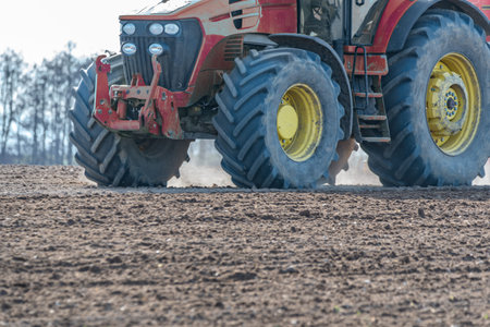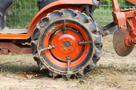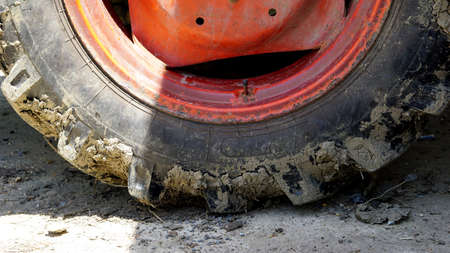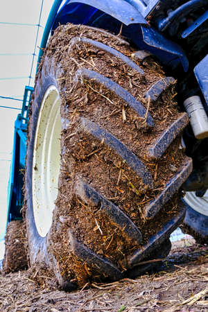 The rubber wheel of the tractor, dirty from the soil in the field, is smeared during the processing of the soil for planting the crop