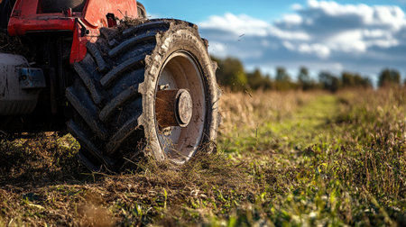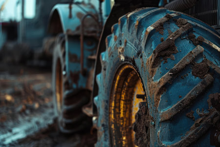 A close-up shot of a tractor's wheel and tire, showcasing its rugged design and texture against a blurred background of other machinery. --ar 3:2 --v 6 Job ID: f335aa9c-db2f-4cdf-9c9a-f6c01aa0fa55