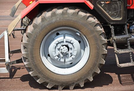 Close-up of the front wheel of a tractor Belarus. Strong tire tread on the wheel. Rural life