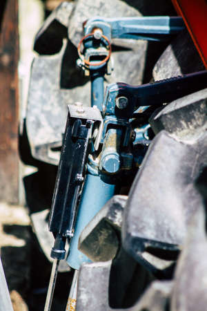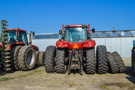 Russia, Temryuk - 15 July 2015: Tractor. Agricultural machinery tractor. Parking of tractor agricultural machinery. The picture was taken at a parking lot of tractors in a rural garage on the outskirts of Temryuk.