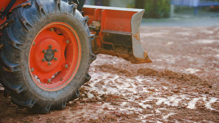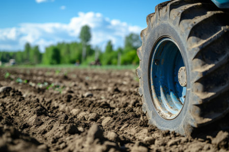 Close-up of a tractor tire on muddy soil, showcasing rugged texture and agricultural utility.