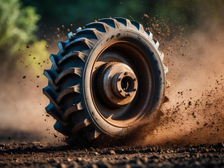 Dynamic close up of tractor wheel in motion on dirt road with scenic rural landscape background