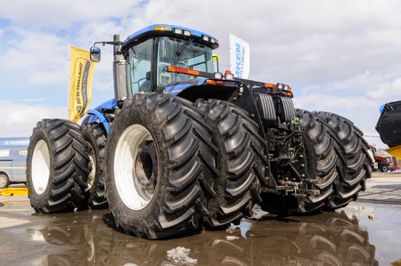 Tyumen, Russia - April 04. 2014: IV Tyumen specialized exhibition Agricultural Machinery and Equipment. Tractor demonstration on platform open-air
