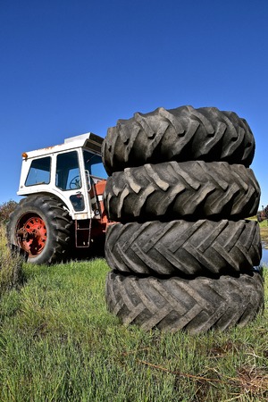 Old tractor and truck wheels, detail of old worn and damaged tires, gum and rubber