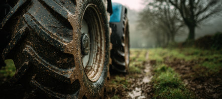 Close-up of a tractor tire covered in mud and raindrops on farmland. Captured in overcast morning light, this image highlights rural life and agricultural machinery.