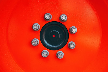 Tractor wheel rim with lock nuts as background